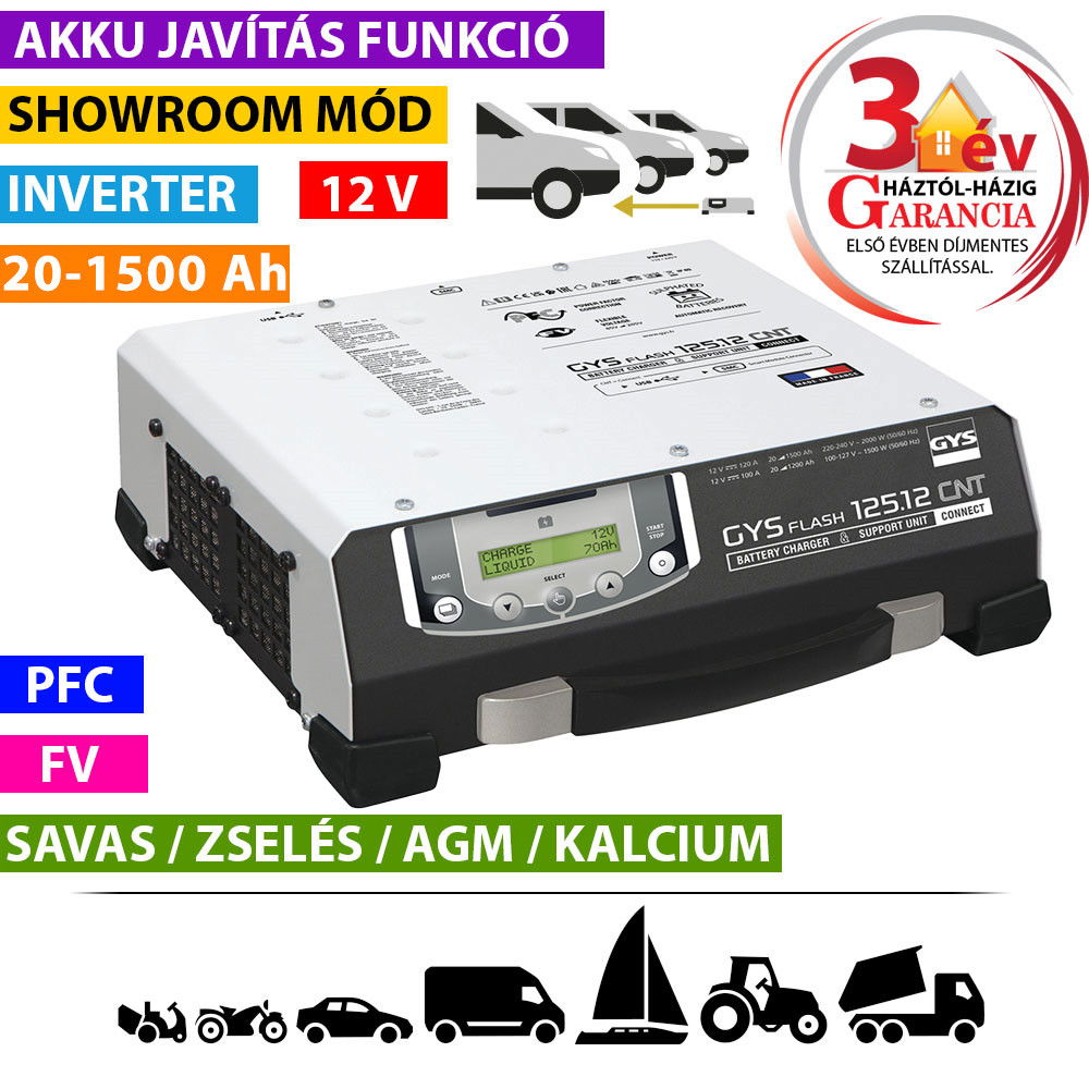 GYSFLASH 125.12 CNT FV inverteres akkumulátor töltő (5 m kábel)
