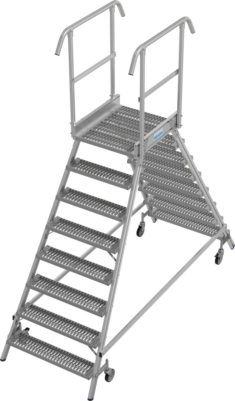 • Két oldalon járható gurítható alumínium dobogó 180 mm mély lépcsőfokokkal és nagy állófelülettel R13 csúszásmentes profilrácsból, amely körbefutó dobogókorláttal van felszerelve a biztonságos és kényelmes munkavégzés érdekében.